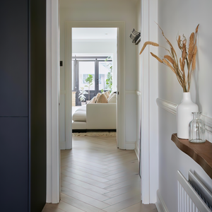 Ashton & Rose Dalton Herringbone flooring. This high-quality engineered wood flooring features a captivating herringbone pattern. The Cappuccino Oak colour brings a warm, inviting tone that highlights the wood’s natural grain and texture. Ideal for both contemporary and classic interiors, each plank is designed for easy DIY installation, offering a sophisticated look that stands the test of time.